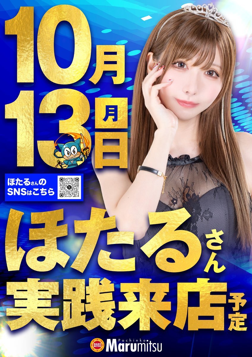 おはようございます😆✨ #まるみつ鶴崎店 です! 本日10月13日10時OPEN #ほたる さん💕 実践来店(予定)です! ぜひ!会いに来てくださいね🎶 皆様のご来店お待ちしております🥰 pic.x.com/Yq3mVQOfJS