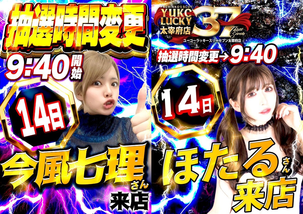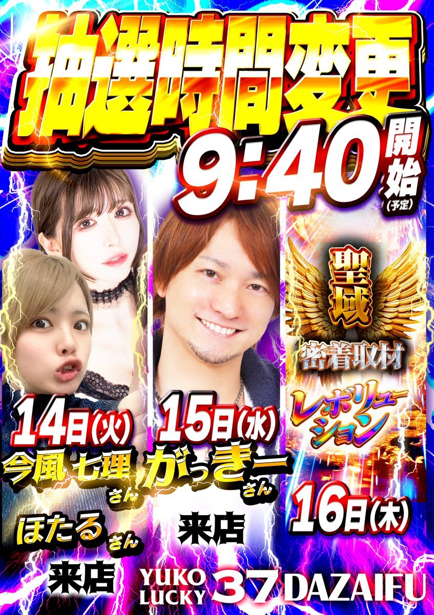 この勢いのまま… 🚨続報NEWS🚨 #ユーコーラッキー37太宰府店 抽選時間変更▶️▶️「9:40」 お楽しみ要素満載の企画 ご用意しております😎 1️⃣4️⃣日 #今風七理@imakazenanari )さん #ほたる@hotaru0426)さん 1️⃣5️⃣日 #がっきー@gacky0301 )さん 1️⃣6️⃣日 #聖域密着取材「レボリューション」 pic.x.com/5px1irppnk