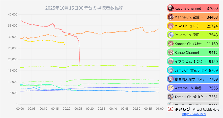 🏆2025年10月15日00時台 【🥇37,600】Kuzuha Channel #くずなま 【スクリム監視カップ】村の現状を覗きに行きま… 【🥈34,403】Marine Ch. 宝鐘マリン #マリン航海記 【 #ホロライブ甲子園2025】3年目夏!!… 【🥉29,724】Miko Ch. さくらみこ #みこなま OBSを全ロス… pic.x.com/4G4jAOwkAn