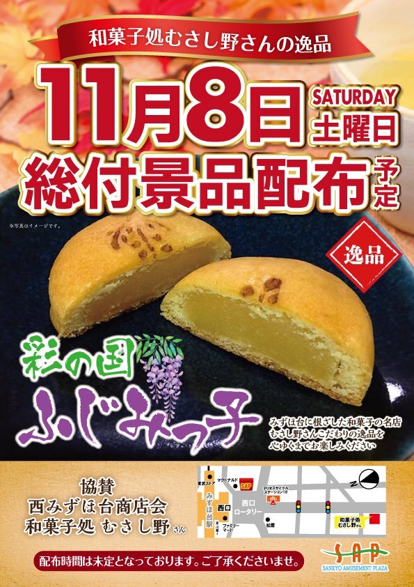 こんばんは😁 週末はSAPみずほ台店へ☺️ 1⃣1⃣月8⃣日(土)は総付景品配布予定です😁 今回は西みずほ台商店会和菓子処 むさし野様にご協力いただきました😆 ぜひご賞味下さいね🫣 週末もご来店お待ちしております😁 #みずほ台 #週末 #彩の国 pic.x.com/PGY4jH2wNE