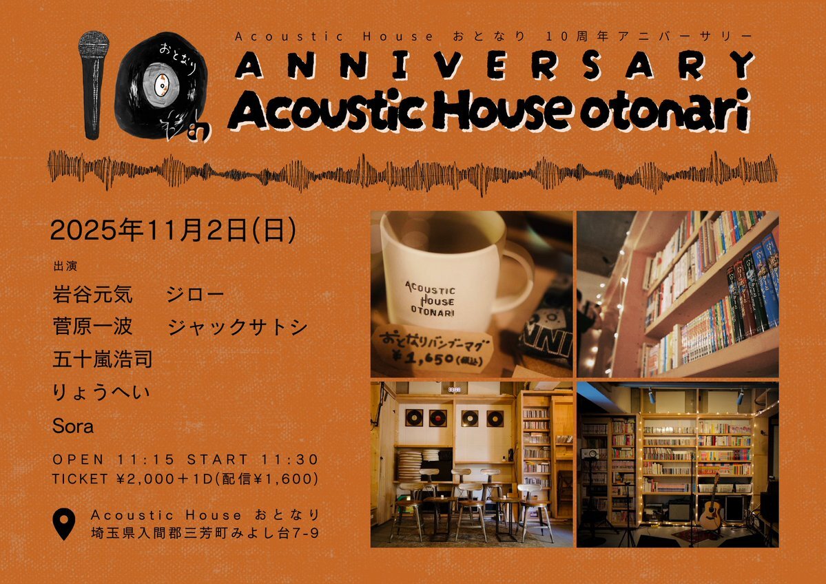 🎸 【11/2(日)11:30〜】 🎤 🎹ジャックサトシ弾き語り出演🎹 🎷2025/11/02(日)@Acoustic House おとなり(埼玉) 🎻 🎶 otonari 10th anniversary special ! 🎶 ◆OPEN/START 11:15/11:30◆ ◇TICKET/ONLINE 2000円+1D/1600円◇ 🎧with:ジロー/Sora/りょうへい/五十嵐浩司/菅原一波/岩谷元気