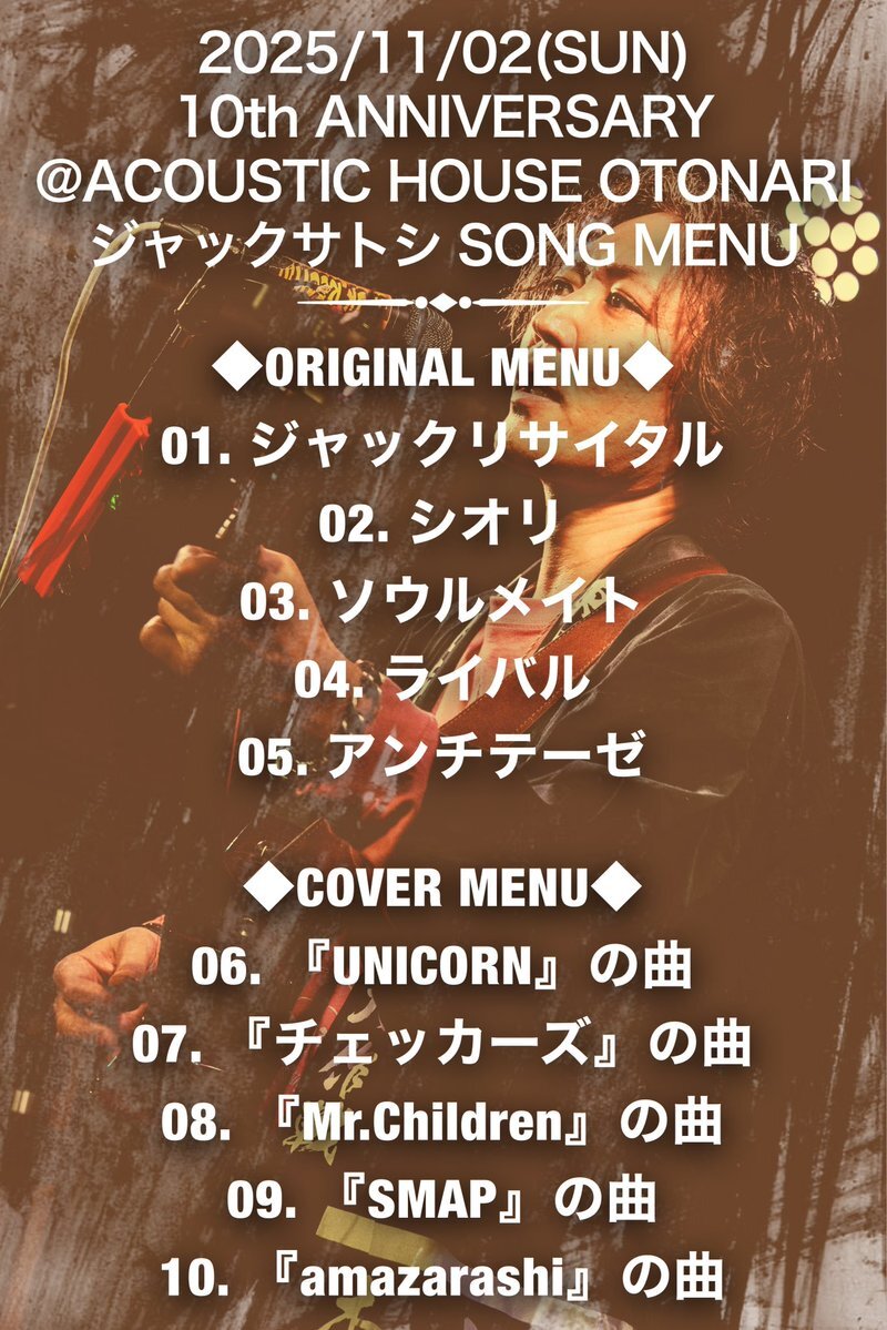 【2025/11/02(日)ソングメニュー公開】 #セトリオーダーシステム #ソングメニュー #弾き語り #みずほ台 #おとなり #アコースティックハウス #acoustic #otonari #anniversary #アニバーサリー #オリジナル曲 #カバー曲 #ジャックリサイタル #チェッカーズ #SMAP #UNICORN #ミスチル #amazarashi pic.x.com/zIkwl1bNNr x.com/jack_satoshi/s…