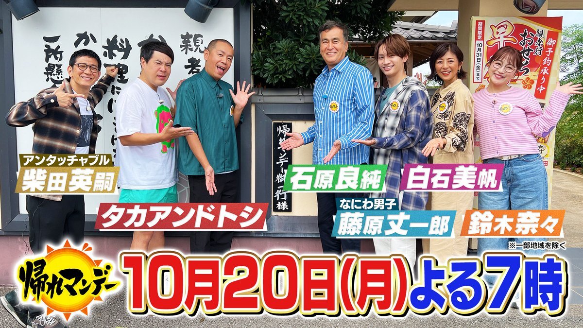 【10月20日(月)よる7時📺】 #帰れマンデー ☀️は… #帰れま10 特別編✨ 今話題🔥 #茨城県 の ローカルチェーン店を巡る‼️ 茨城県出身💫 #白石美帆 #鈴木奈々 が参戦❤️🔥 #石原良純 #藤原丈一郎 💙 #なにわ男子 #柴田英嗣 #アンタッチャブル #タカアンドトシ #ばんどう太郎 #グルービー #粉とクリーム