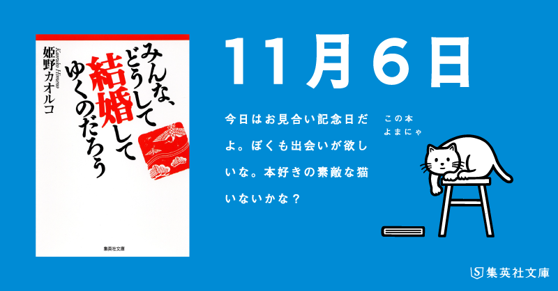 【 #日めくりよまにゃ 】 今日は #お見合い記念日 だよ。 ぼくも出会いが欲しいな。本好きの素敵な猫いないかな? #姫野カオルコ「#みんな、どうして結婚してゆくのだろう」 #よまにゃ shueisha.co.jp/books/items/co… pic.x.com/5qbiAHzhe0