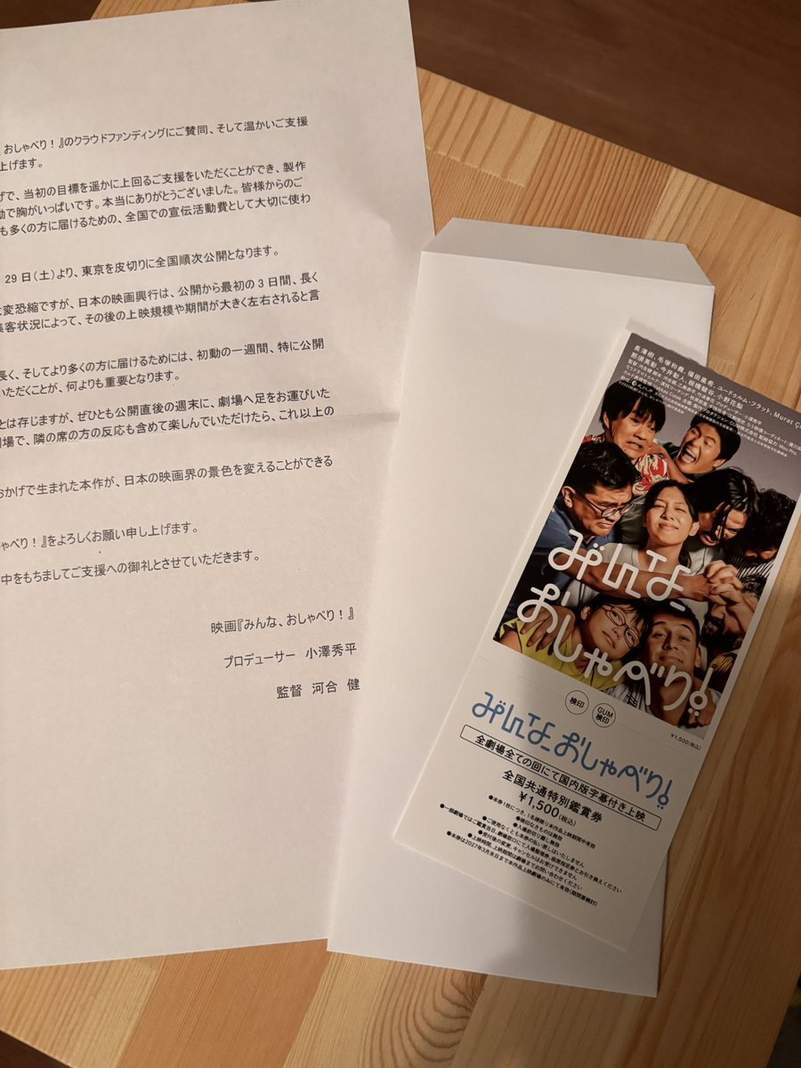 クラファンのリターン受け取りました。 先週の宇多丸さんのラジオでも、めちゃくちゃ面白いし、知らないうちにすごい知識が入ってくるみたいなことを語っていたので、すごく楽しみ! 公開が待ち遠しいです! #みんな、おしゃべり! #河合健 pic.x.com/Jq1SgVya98