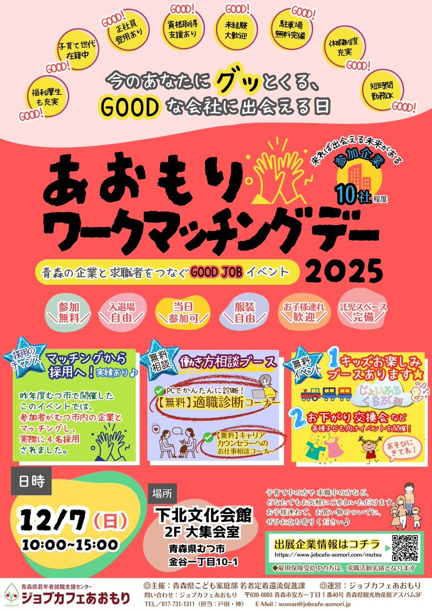 🔅あおもりワークマッチングデー2025🔅 12/7 #むつ #下北文化会館 にて開催✨ 🔹参加無料 🔹入退場自由 🔹予約不要 青森の企業と求職者をつなぐイベントです😊 お子様が楽しめるブースもあります🧒 ※協同組合マルチワーカージョブステーション鯵ヶ沢様が欠席となりました お問合せ 017-731-1311