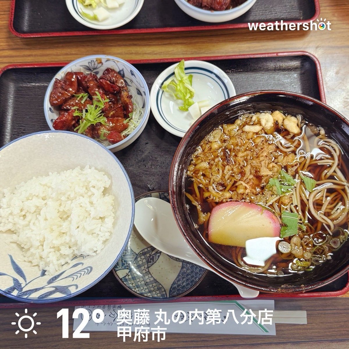 (昨日の投稿分、漏れてた) 甲府お天気晴れ☀ お仕事で甲府に来てます。 朝方は少し寒かったけど日が差して暖かく… いつものお蕎麦屋さんで… たぬきそばセット! (゚Д゚)ウマー ※今日もご馳走になりました。🙏✨ #奥藤 #奥藤丸の内第八分店 #蕎麦 #たぬきそば #甲府 #もつ煮 #もつ煮込み pic.x.com/172r0CW0CP