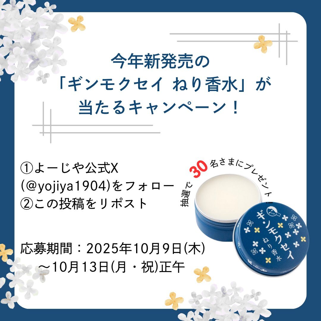 ✨フォロー&リポストで応募完了✨今年新発売の「ギンモクセイ ねり香水」が当たるキャンペーン開催🎉秋にぴったりなほのかでやさしい香りに包まれる時間を楽しみませんか?よーじやで毎年期間限定で販売している「ギンモクセイ」シリーズから、今年新発売の「ギンモクセイ