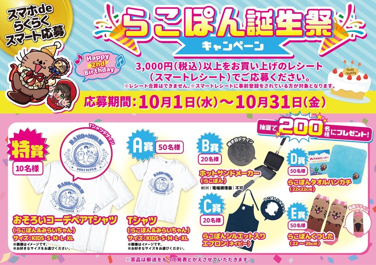 \\🦦スマホdeらくらくスマート応募🦦// 🎊🦦らこぽん誕生祭2025🎂🎉 ⭐️⭐️HAPPY 2️⃣nd BIRTHDAY⭐️⭐️ ㊗️10月1日は #らこぽん🦦の2才のお誕生日❣️ らこぽん🦦から🩷だ〜いすき🩷なみんなにプレゼント🎁 ⭐️合計2️⃣0️⃣0️⃣名様 <応募期間> 🗓️10月1日(水)〜31日(金)まで <応募方法> x.com/AokiSuper_CoLt…
