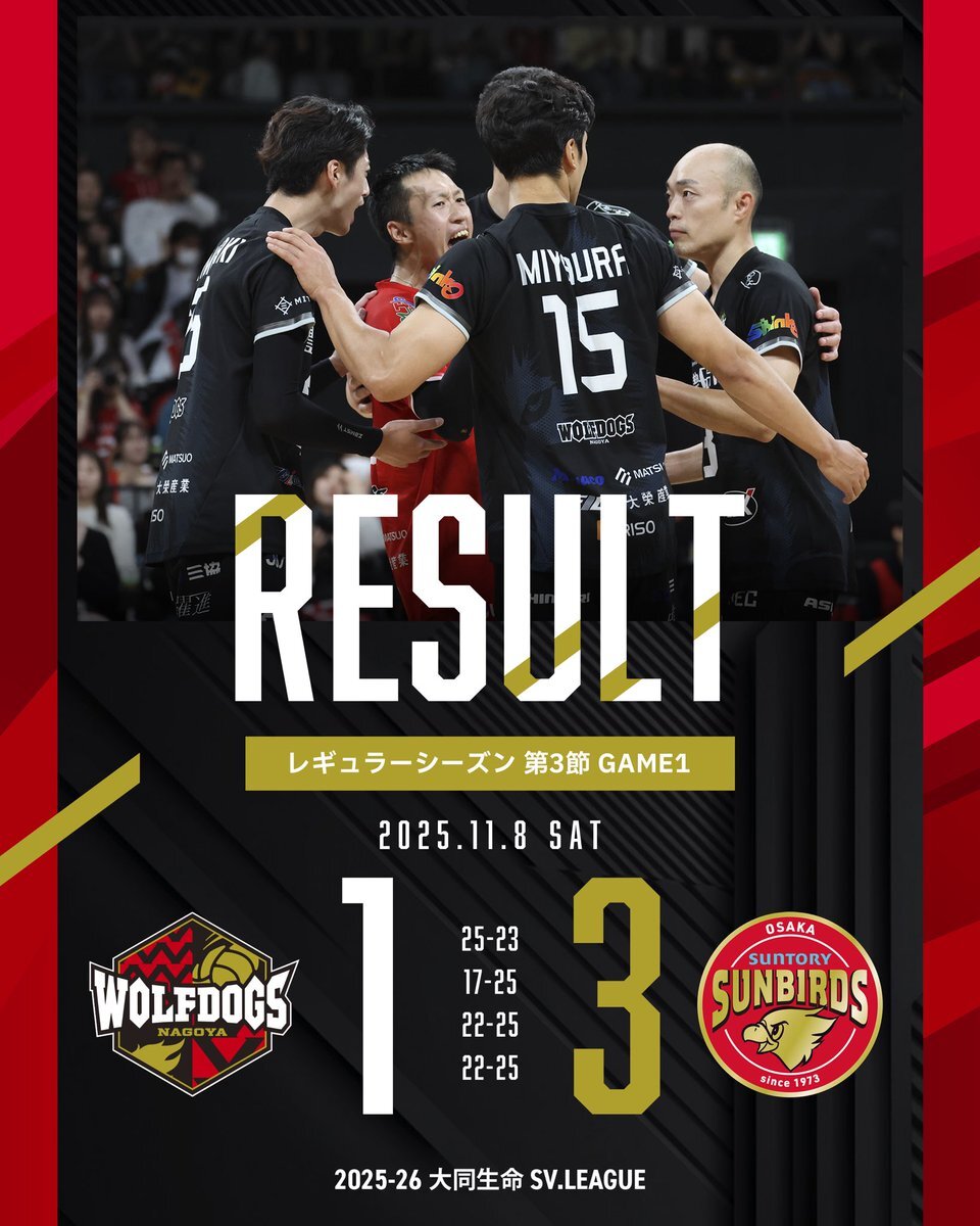🐺MATCH REPORT🐶 2025-26 第3節 GAME1🏐✨ \🦦アオキスーパーDAY🦦/ 🗓️11/8(土) 14:35 🆚 #サントリーサンバーズ大阪 📍豊田合成記念体育館 エントリオ SET COUNT 1-3 (LOSE) 1️⃣25-23 ⭕️ 2️⃣17-25 ❌ 3️⃣22-25 ❌ 4️⃣22-25 ❌ 3win 2lose🐺🐶 本日もたくさんの応援をありがとうございました! x.com/wolfdogs_nagoy…