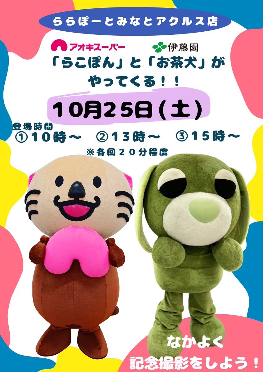 \\ ✨お茶犬🍵🐶❤️🦦らこぽん🎶 // 子どもから大人まで大人気の #お茶犬🍵🐶と #らこぽん🦦が #ららぽーとみなとアクルス 店にやってくる❣️ 🗓️10月25日(土) 📍ららぽーとみなとアクルス店aokisuper.co.jp/shop/detail/?i… 🕙10時~(1回目) 🕐13時~(2回目) 🕒15時~(3回目) *各回約20分
