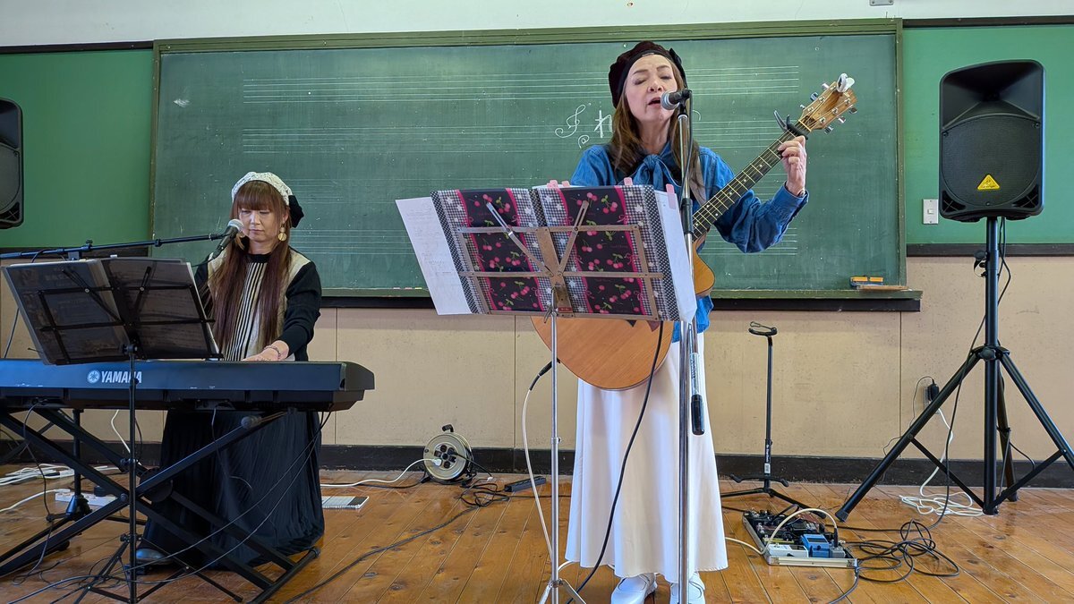 対比が面白くもあり妙にマッチしているように感じたり。音楽室では「れんげ」のライブ、黒板の前で懐かしい歌がよく似合う。⇒ #awanoartfestival #ebi #れんげ pic.x.com/J1xkfOEipo