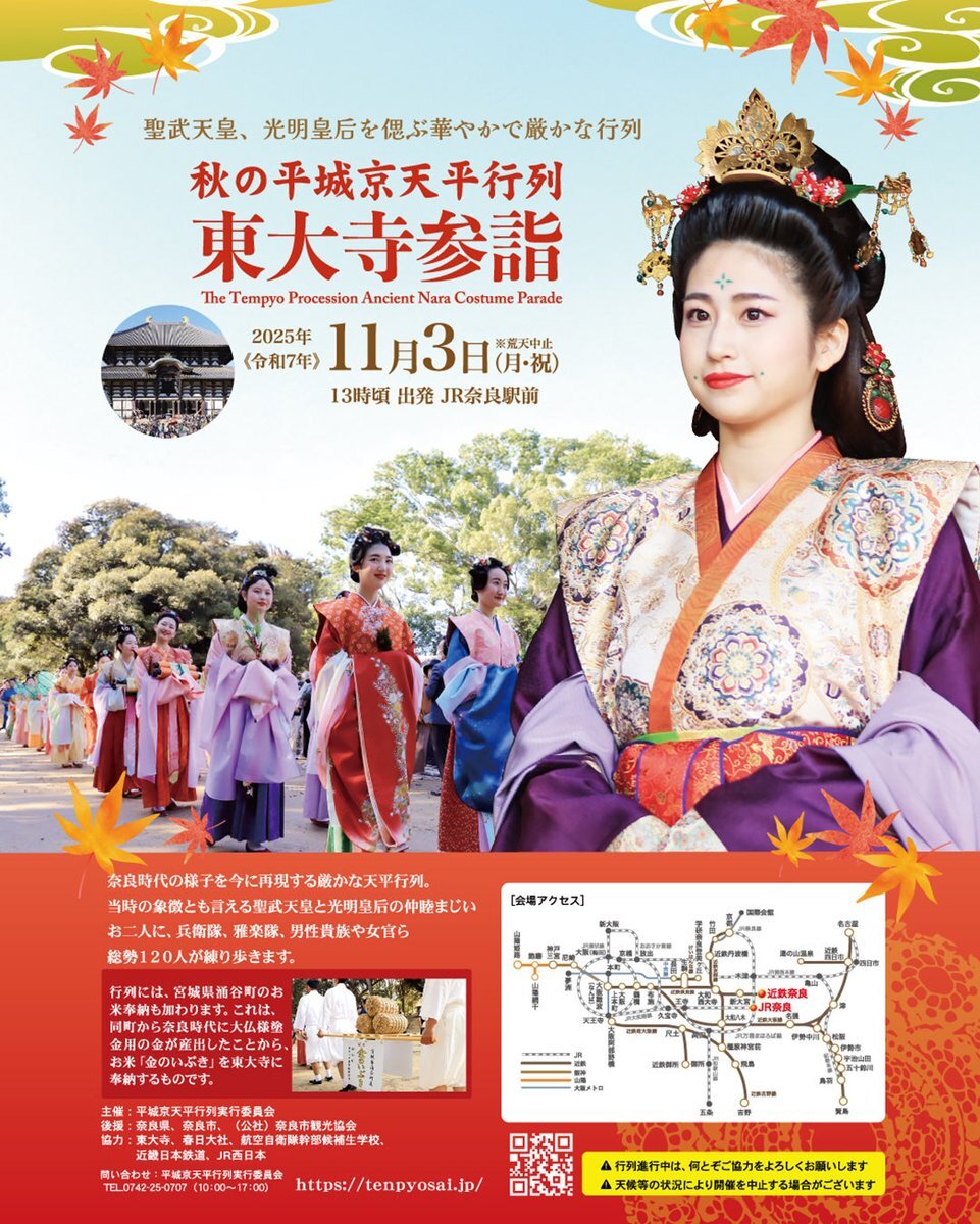 秋の平城京天平行列🍁東大寺参詣 東大寺建立の詔を発せられた聖武天皇と光明皇后のご遺徳を偲ぶためお二人を中心とした総勢120人が練り歩きます。 📆2025/11/3㊗︎ 🕐13:00〜16:00頃 📍JR奈良駅→三条通→奈良公園→東大寺 🔗tenpyosai.jp/event-todaijis… #平城京天平祭 改 #平城京天平行列 #東大寺参詣
