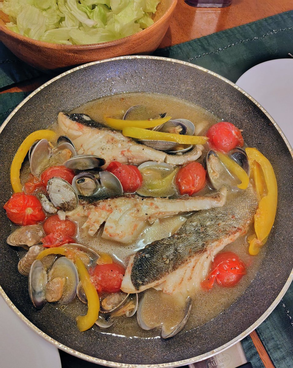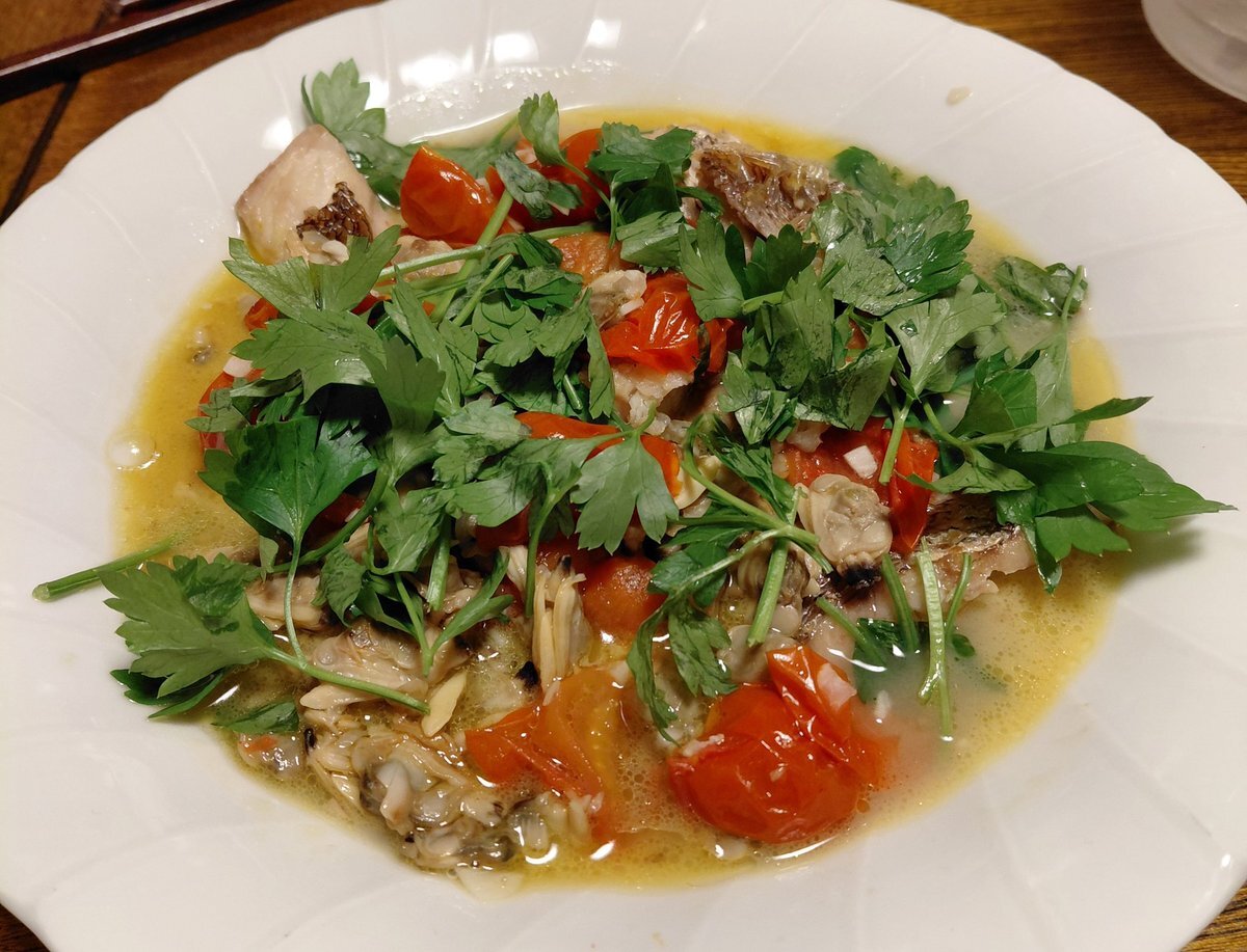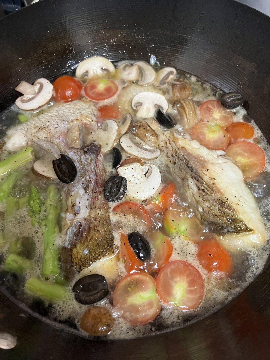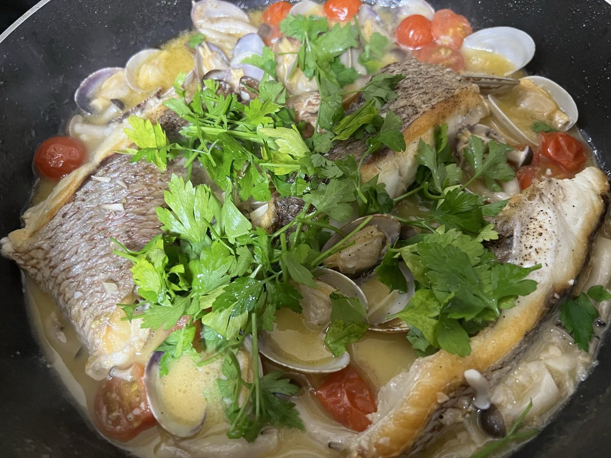 切り身で作る簡単アクアパッツァ、10年ぶりぐらいに作った。やっぱり鯛が美味しい。 やっと料理できるぐらいまで元気になってきたかな。 #クックパッド #アクアパッツァ pic.x.com/FmLmpKNv6B