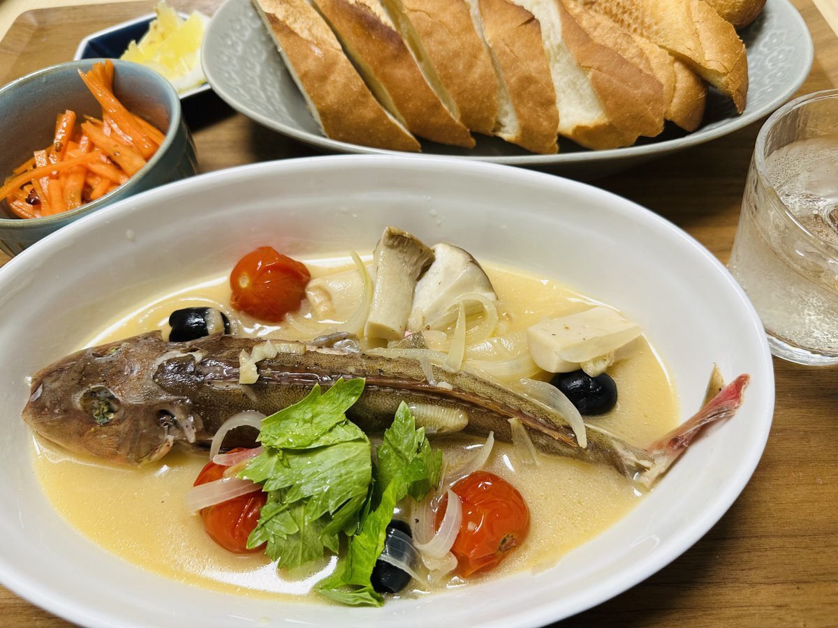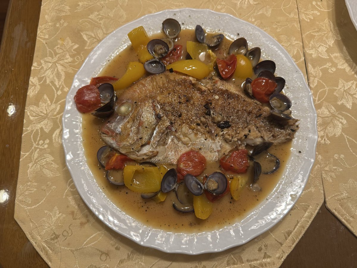 今日は1日雨模様☂️職場の近くに魚屋さんも買いにくる魚屋さんがあって、行ったら鯛が手に入ったので、アクアパッツァを作ってみました。昨日が27回目の結婚記念日だったので、プチお祝いかな?😁おいしかったです🐟 #アクアパッツァ pic.x.com/ohXC1X3BHS