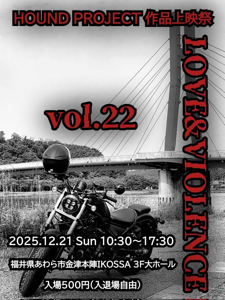 チラシが出来ました! いよいよ近付いてきましたね!あれこれやりたい事やらなきゃな事多いですが、へへへ編集頑張ります💦 HOUNDPROJECT作品上映祭 「LOVE&VIOLENCE vol.22」 12/21(日) 10:30~17:30 福井県あわら市金津本陣IKOSSA 3F大ホール maps.app.goo.gl/8oP7HzdmTNPsdG… 入場500円(入退場自由)