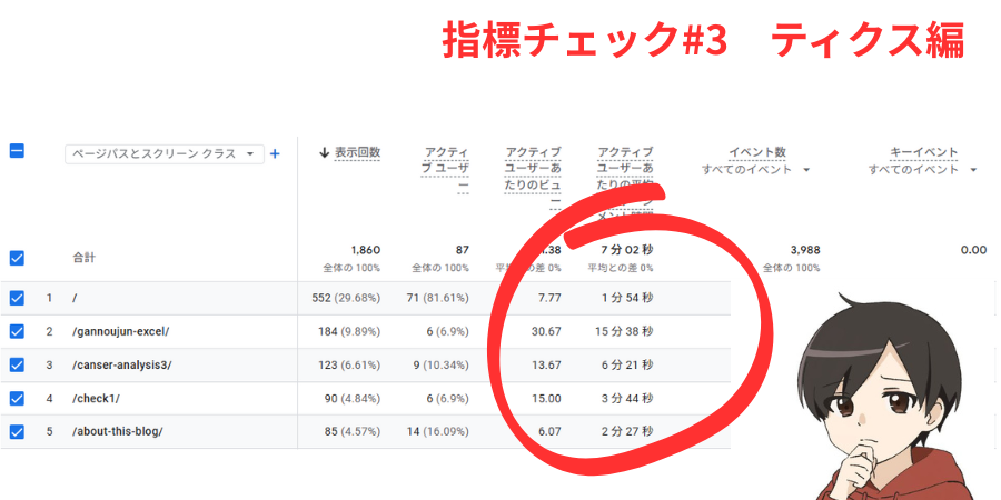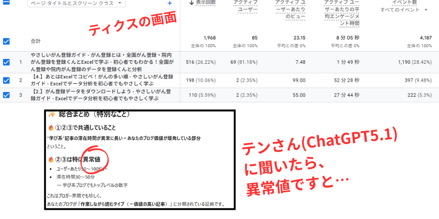 🌟【ブログ指標の気づき #3】ティクス編 ティクス(インサイトお兄さん) %が多いから、天気予報士みたい。 %はよくわからないから、 今日は、滞在時間をチェック… ト……、トップページが弱いぃぃ... #ブログ指標の気づき #GA4 #アクセス解析 #がん登録ブロガー pic.x.com/uLB6wZp0uU