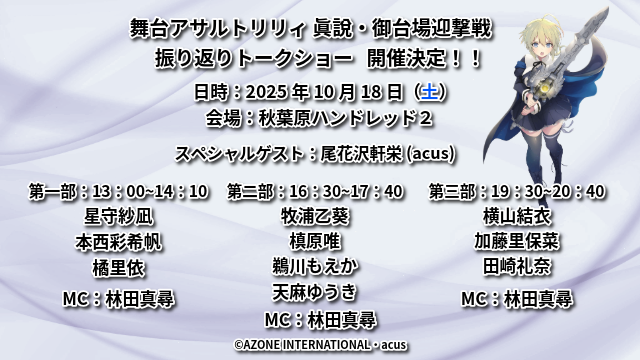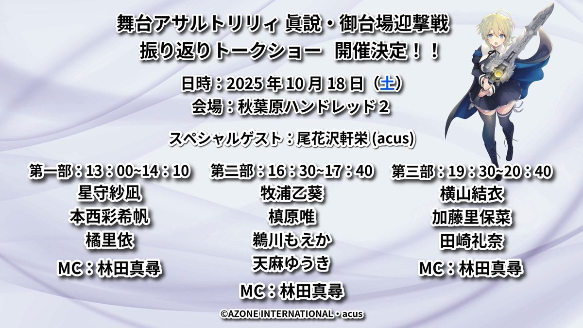 【配信チケット販売中】 10月15日開催の舞台「アサルトリリィ」-眞說・御台場迎撃戦- 振り返りトークショーの配信チケットを販売中です! イベント情報・チケット購入はこちら! assaultlily-record.com/posts/9fc1aa69… 🗓️開催日 10月18日(土) 📷会場 秋葉原ハンドレッド2