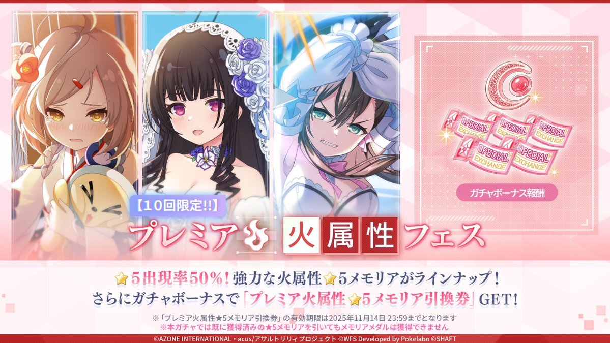 【🔥【10回限定!!】プレミア火属性フェス開催中🔥】 火属性の強力な★5メモリアがラインナップ! さらに★5メモリアの出現率が50%&コスト21以上のみ排出🌟 ガチャボーナスで「プレミア火属性★5メモリア引換券」など豪華アイテムをGET❤ #ラスバレ #アサルトリリィ pic.x.com/Leh293K30n