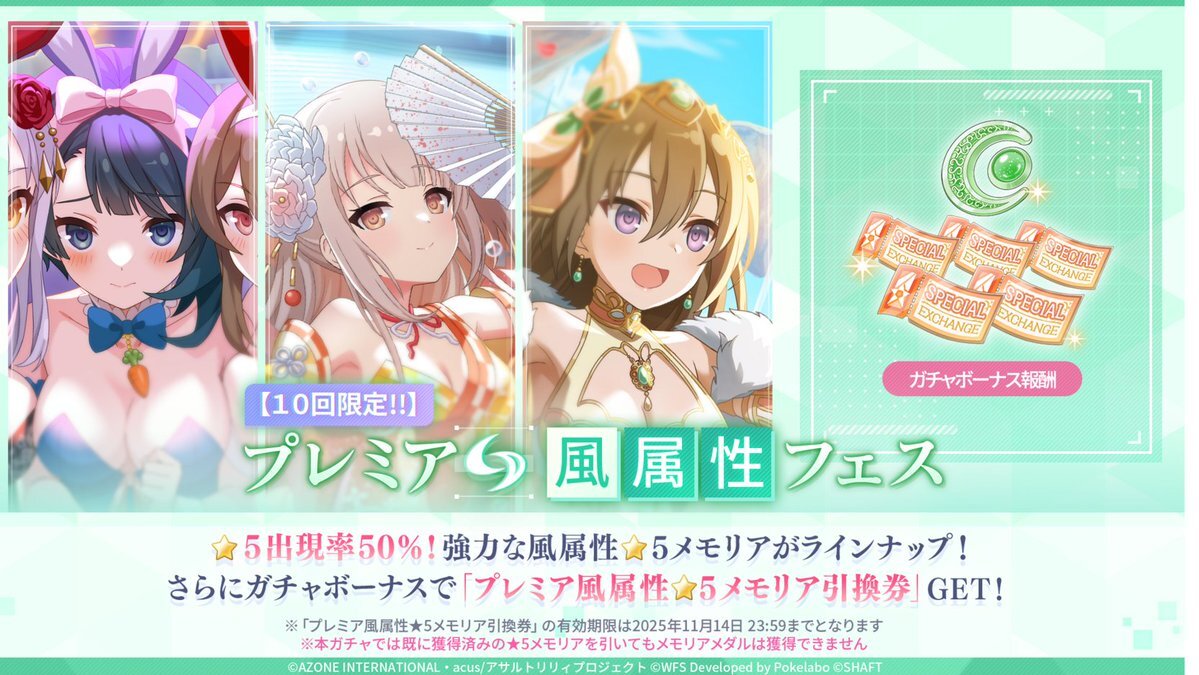 【🍃【10回限定!!】プレミア風属性フェス開催中🍃】 風属性の強力な★5メモリアがラインナップ! さらに★5メモリアの出現率が50%&コスト21以上のみ排出🌟 ガチャボーナスで「プレミア風属性★5メモリア引換券」など豪華アイテムをGET❤ #ラスバレ #アサルトリリィ pic.x.com/1MzflJbDfS