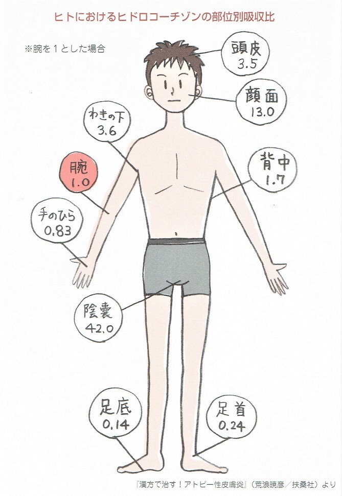 ステロイド軟膏は長く使っているとだんだん皮膚が薄くなるのが困った副作用です。皮膚の場所によって軟膏の吸収度が違います 腕を1とすると、ほおは17倍で、薄くなりがちです。薄くなっていくと、下の毛細血管が透けて見えるようになり、赤くなってしまいます。 #アトピー改善 #漢方軟膏 #ウエマツ薬局 pic.x.com/2A4xUBUn1Z