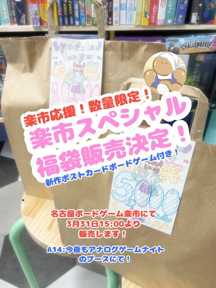 名古屋ボードゲーム楽市応援企画です! 名古屋市と岐阜県に店舗を構えるboys in the band様から『楽市スペシャルboys福袋』をご用意いただけました! 楽市当日15時から今夜もアナログゲームナイトのブースで数量限定品発売! #名古屋ボードゲーム楽市 #ボードゲーム福袋 #boysintheband #アナゲナイ pic.x.com/KNq7XxDP9N