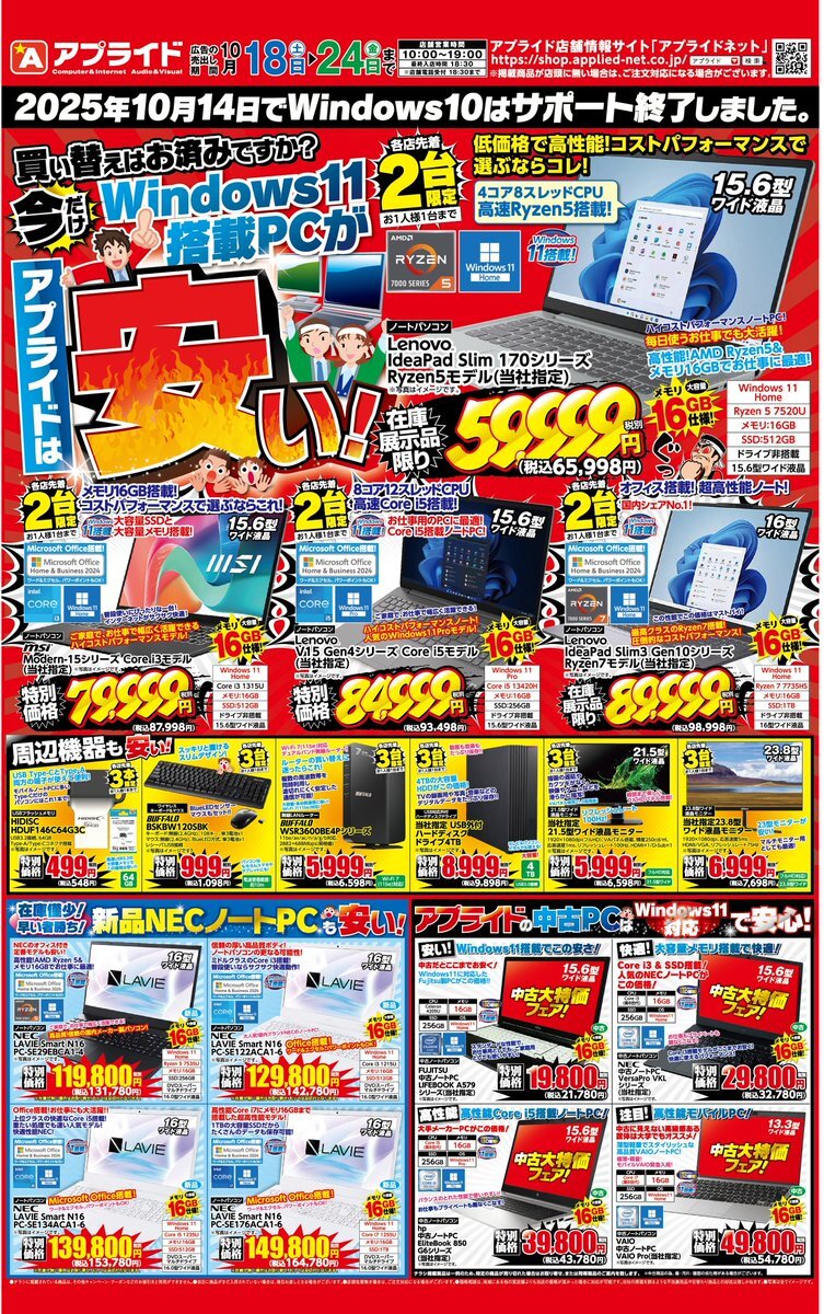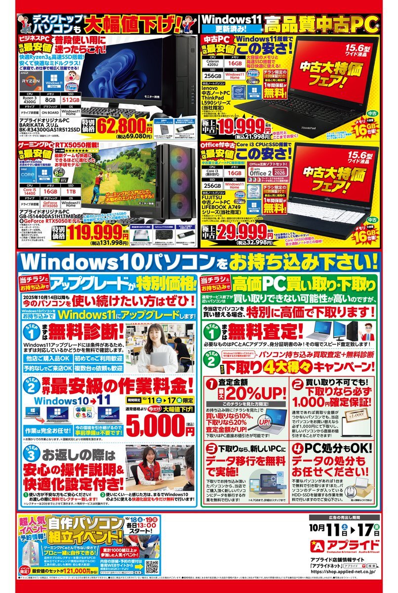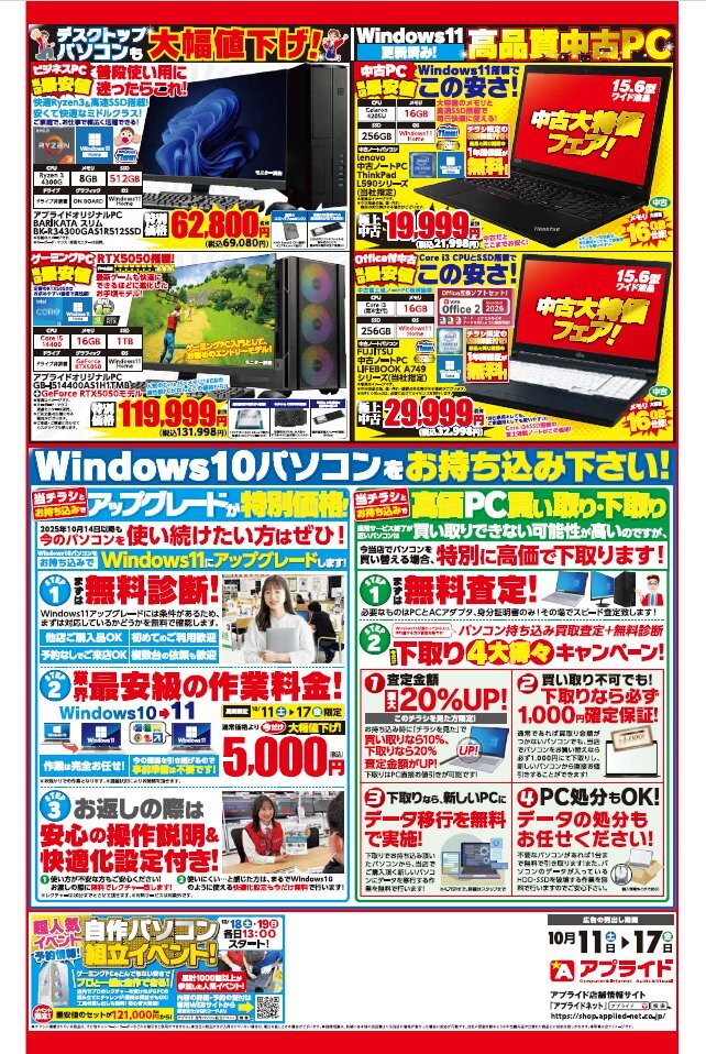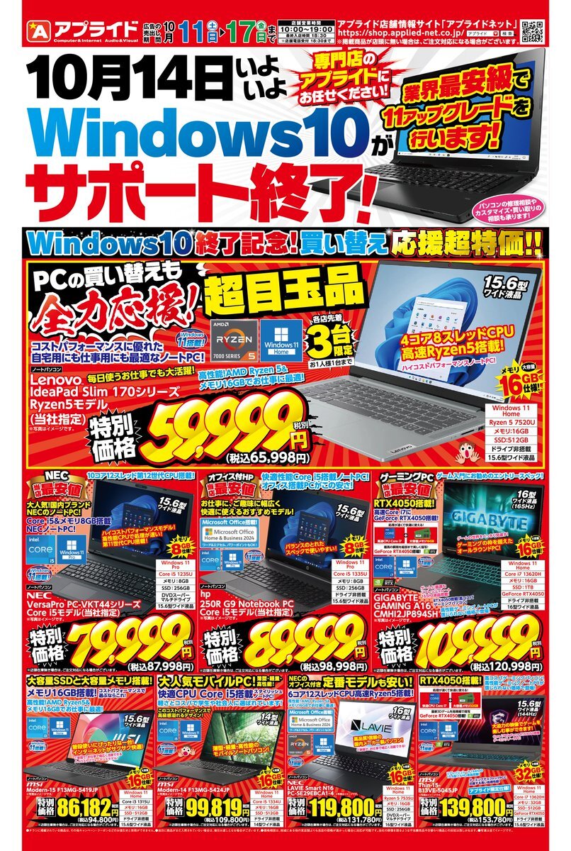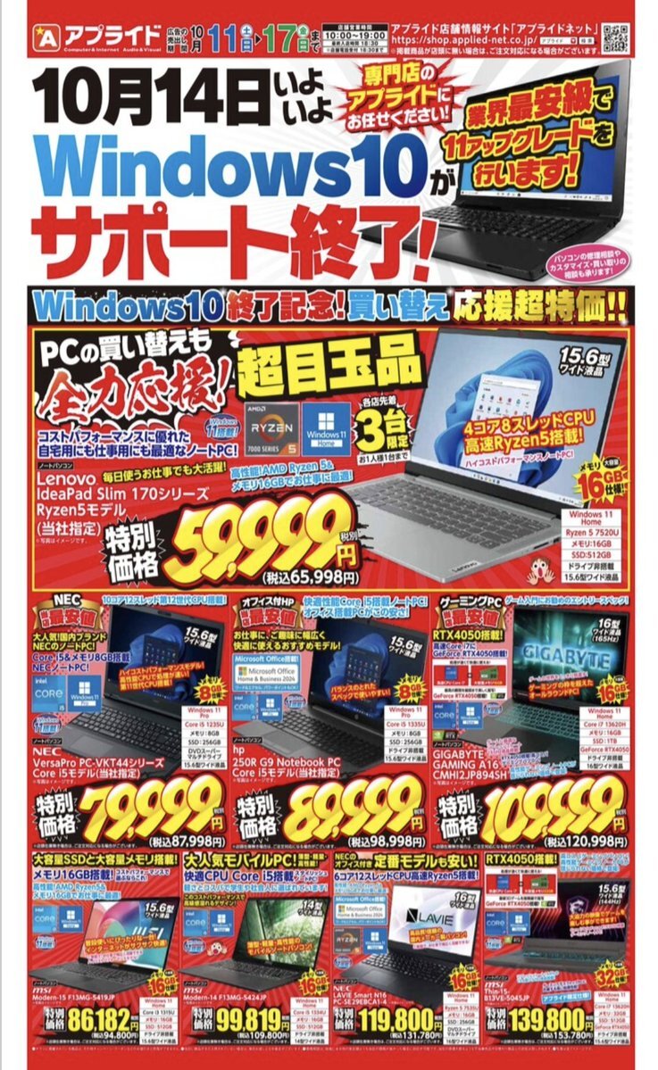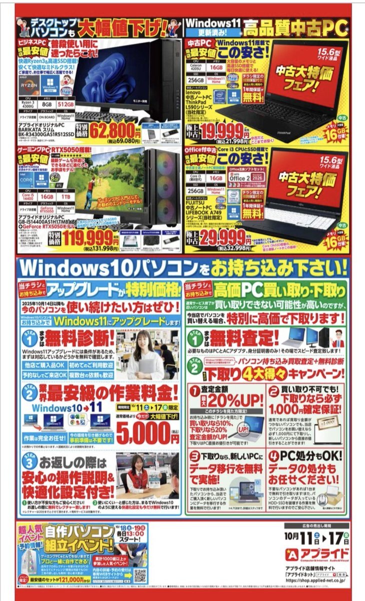 【🎉今週末からのチラシ情報🎉】 先日ついにWindows10がサポート終了しましたね 皆さま移行は完了しましたか?👀 まだの方はぜひアプライドへ!💻 #アプライド #高松 #パソコン pic.x.com/GkeYG82KJZ
