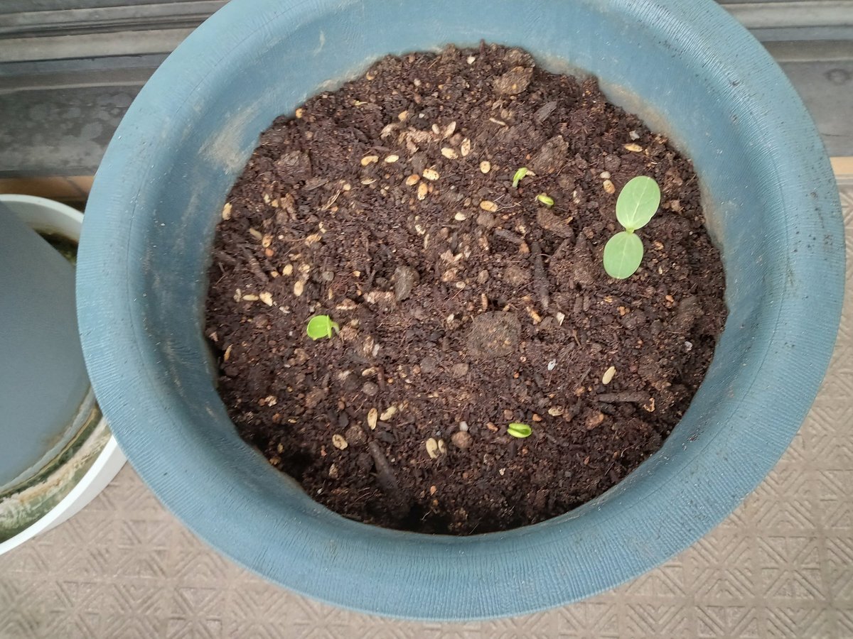 #ベランダ菜園 #ミニトマト #スイカ #アボカド 10月15日曇り 食べた後ピーマンの種撒き→弱弱しく二つ発芽 冬瓜の種、全部ばら撒いたら凄い勢いで発芽開始 スイカ生い茂った一鉢はベトベトして良く見たら黒い虫が一杯、アブラムシ? 仕方なく一鉢丸ごと引っこ抜き、一鉢はまだ無事 アボカド大きく成長