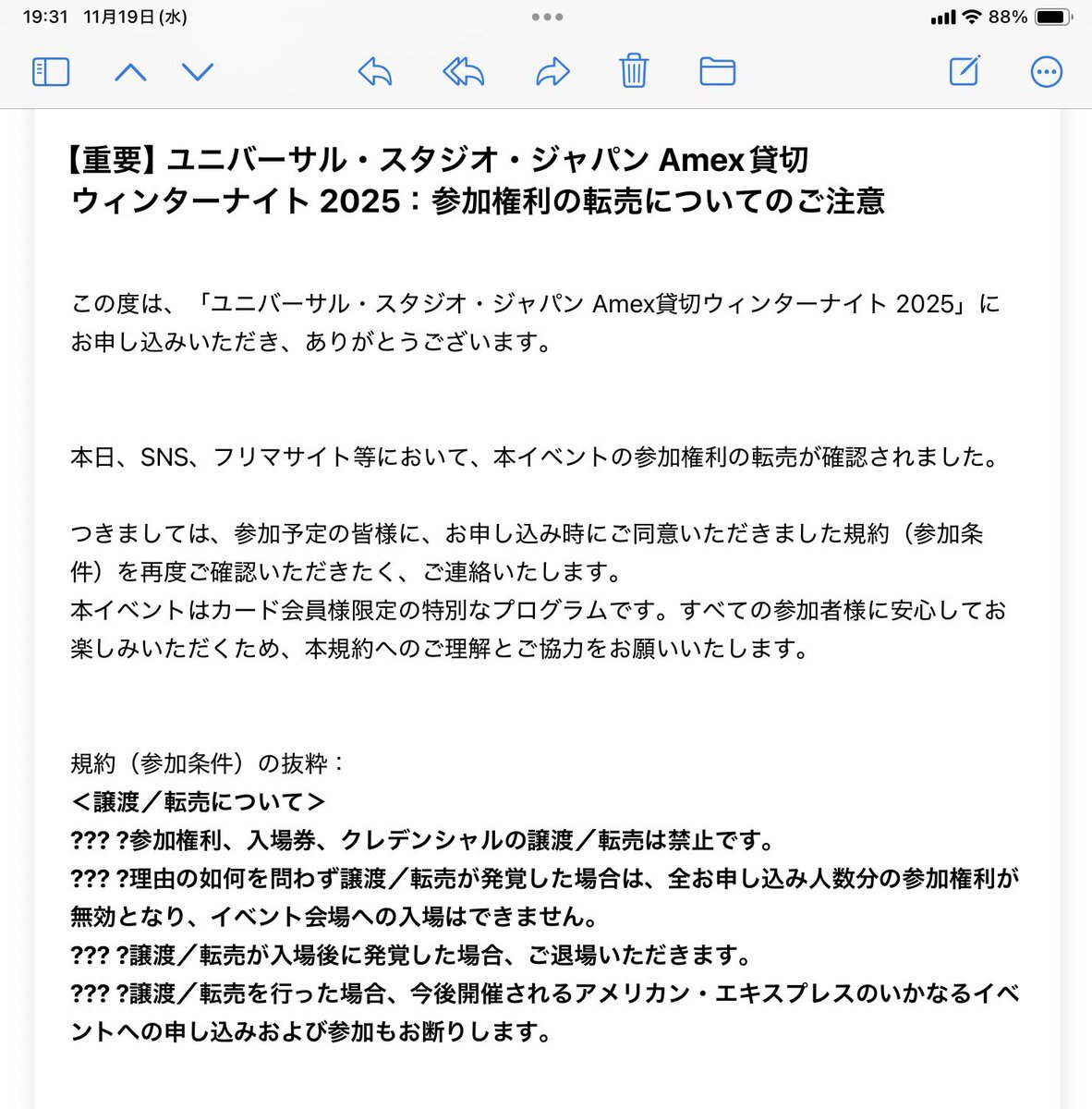 アメックスからメールきたから、てっきり12月に行くUSJの貸切ナイトの発行番号のかな?と思ったら転売に対する怒りをじんわり感じる文面だった😂気になって調べたら有名どころのフリマ全部アメックスの貸切ナイト関連一切無くて(対応済み?)転売対策への本気度が伺えて素晴らしい😁 #アメックス #USJ pic.x.com/Ml6AODIdNH
