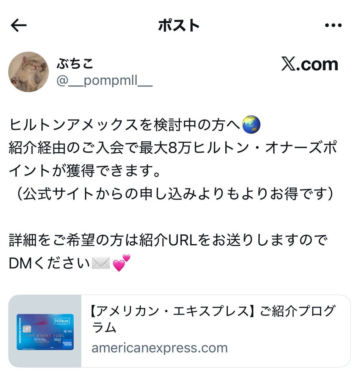 ヒルトンオーナーズアメックス紹介URLをお探しの方はDMまたはリプをお願いします! 現在最大80000ポイントをもらえるキャンペーンが行われています。 #アメックス #ヒルトンアメックス #アメックス紹介 pic.x.com/dzgtoTXD31