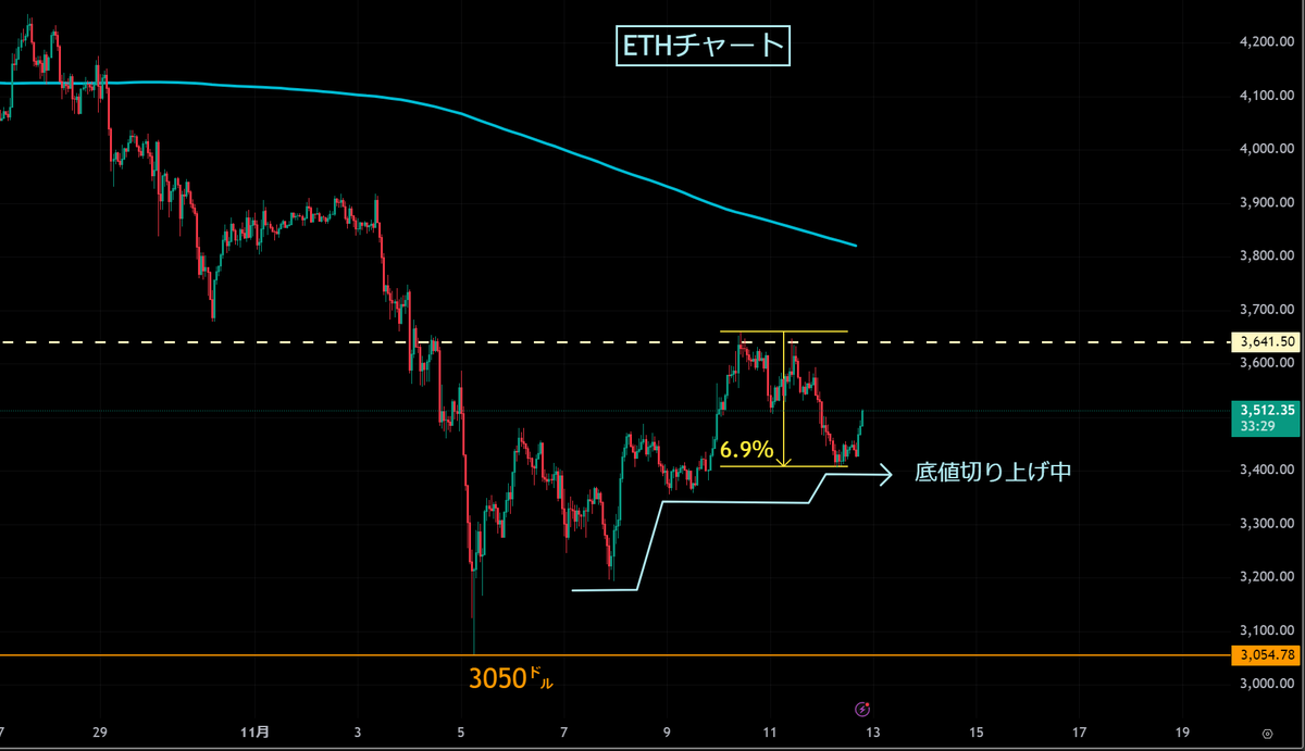 #ETH #アルト 昨日からの下げは17時から反転↗で終わりとなりました ETHで見ても直近天井から▲7%近い下げとなり、じわじわ落ちる厄介な下げでした😵 振るい落としが終わったので、また再び高値更新を目指す流れです📈 今夜NY時間で大きく上昇して、3500㌦台がこれで終われば安心出来ます🙏 pic.x.com/nTCNSmjzL6