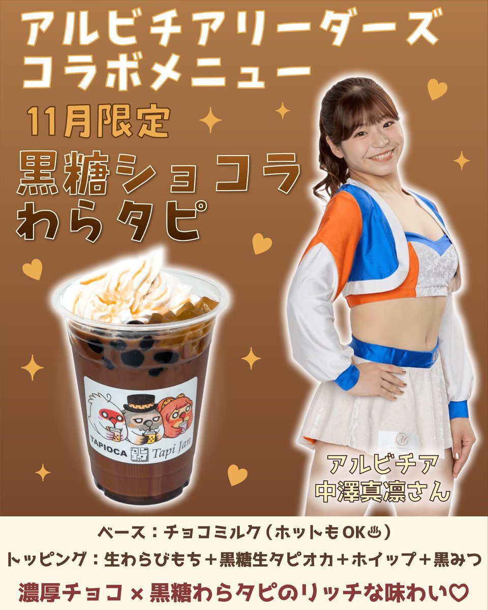 🧋#タピジャン × #アルビチアリーダーズ 11月限定 #黒糖ショコラわらタピ 登場💖 Mサイズ 750円 | ホットOK☕️ 濃厚チョコ×#黒糖生タピオカ×#生わらびもち の 贅沢ご褒美ドリンク✨ 11/15・16 #アオーレ長岡 #アルビBB ホームゲーム限定🏀 コラボパートナー:#中澤真凛 さん @albcheer @naxbb_rb pic.x.com/yJGBvMnVXq