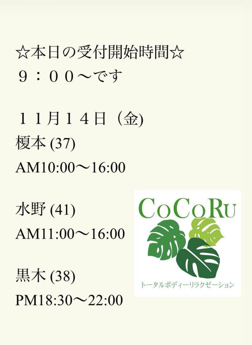 • ★11.14(金)★ 本日の受付開始時間は 9:00からになります🌿 #トータルボディーリラクゼーション #アロマオイル #トリートメント #ココル #群馬県 #伊勢崎市 #サロン #プライベートサロン #パウダー #脱毛 #ワックス脱毛 pic.x.com/GXevp263yR
