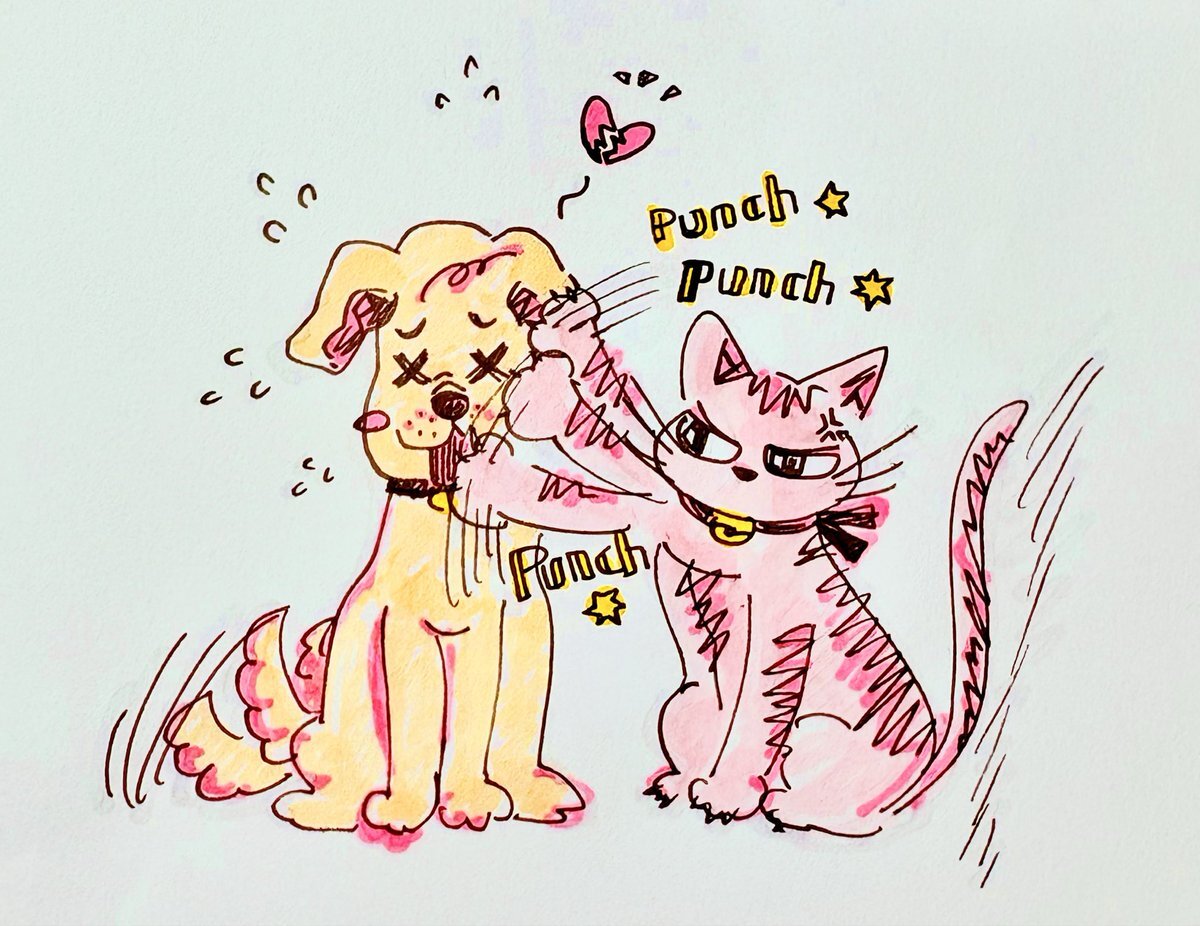 #寝起きチャレンジ 66 ネコパンチ&ワンコ💥🐱🐶՞ ՞ (でもなかよし✨) パンチというより、ひっかいてるように見えるかも(´•ᴗ•;ก) #イラスト好き #犬猫好き #ネコパンチ x.com/ichigousagi_a/…