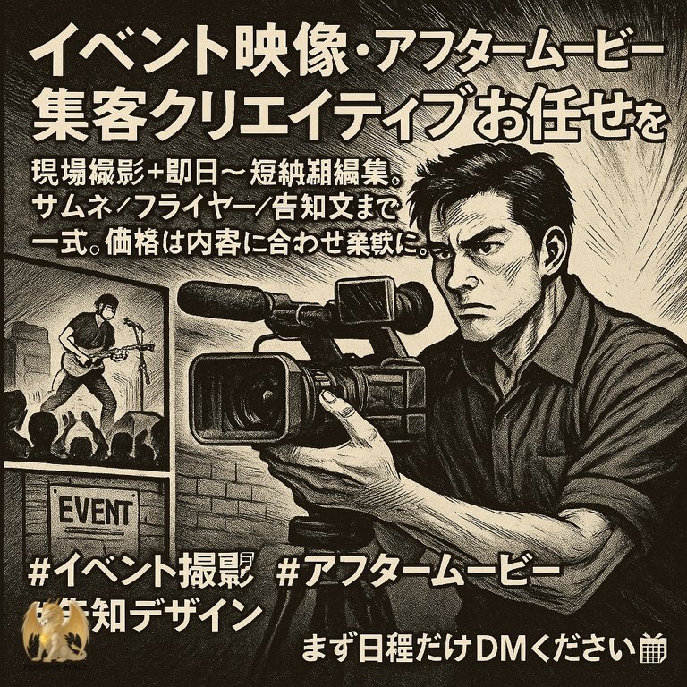イベント映像・アフタームービー・集客クリエイティブお任せを。 現場撮影+即日〜短納期編集、サムネ/フライヤー/告知文まで一式。 価格は内容に合わせ柔軟に。 まず日程だけDMください📆 #イベント撮影 #アフタームービー #告知デザイン pic.x.com/R7zINs4KtS