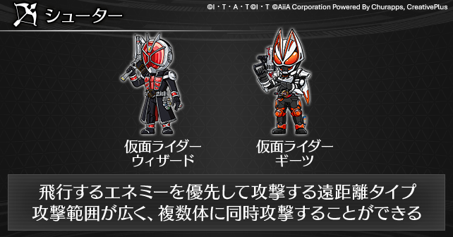 ◤タイプ紹介⑥シューター◢ シューターは飛行するエネミーを優先して攻撃する遠距離タイプ! 攻撃範囲が広く、複数体に同時攻撃することができます。 シューターのユニットは以下の2体! 仮面ライダー #ウィザード 仮面ライダー #ギーツ ユニットはリリース後続々と追加予定! #ライD pic.x.com/AXwQhTA3ms