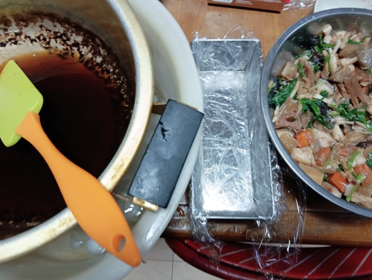 テリーヌを作ります エイ、大根、蓮根、人参、蒟蒻、セリ、牛蒡、椎茸、里芋、鰹出し、醤油、味醂、砂糖、ゼラチン を合わせます 今から型につめて 冷蔵庫でねかします🌛 #テリーヌ #エイ #冬野菜 pic.x.com/MYuvStrWEG
