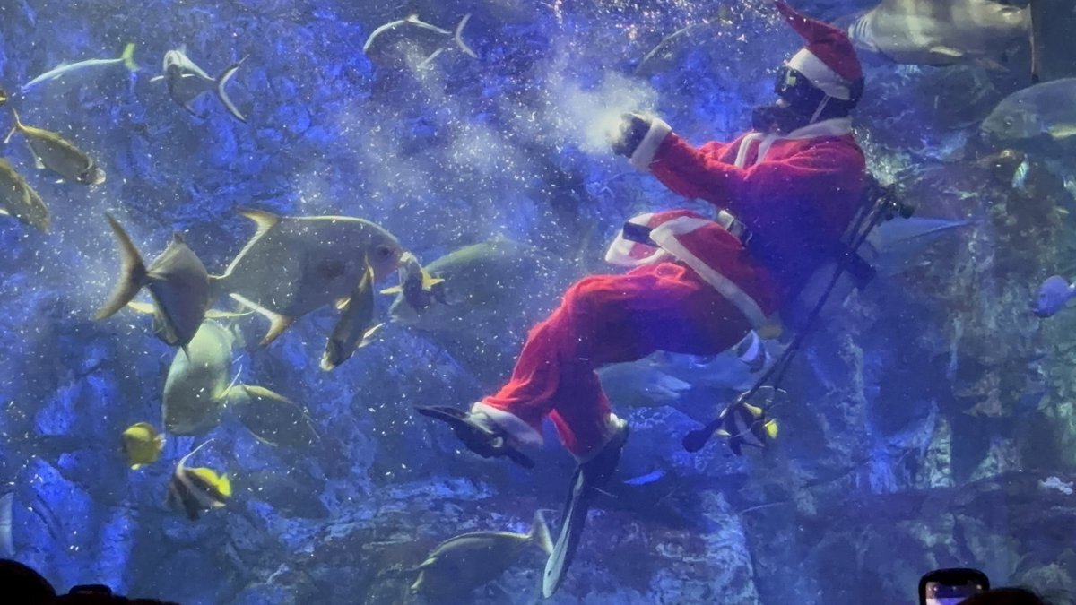 返信先:@umitamago_staff餌を配るサンタダイバーごと食べちゃいそうに見える水族館の魚たち25.12.20 #うみたまご #エイ #aquarium pic.x.com/ooIWnVzd6i