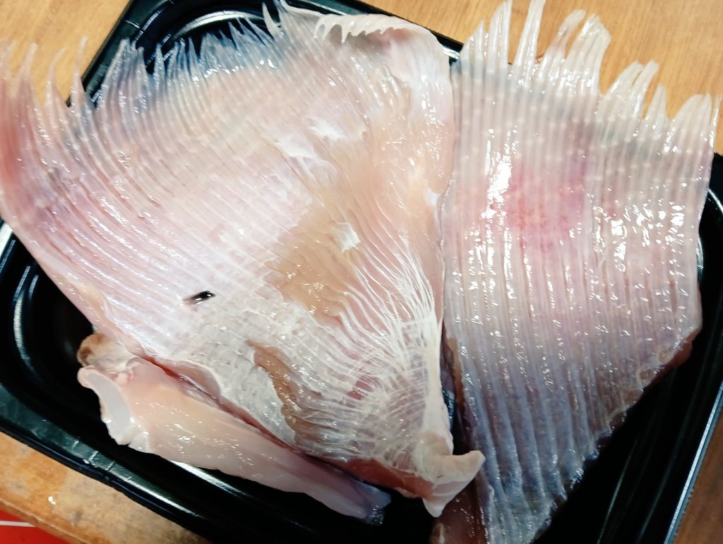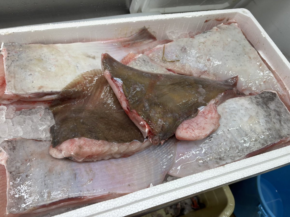 珍しい物入ってます🐟 種類までは不明ですが #エイ のヒレ😲 名古屋っ子の主は #カスベ と教わりましたが北陸では #コッペ と呼ばれるみたいです💡 頑張って皮剥いて切り身にしてありますので興味のある方は煮付けやムニエルにしてお召し上がりください😌 pic.x.com/mgcfji2p4u