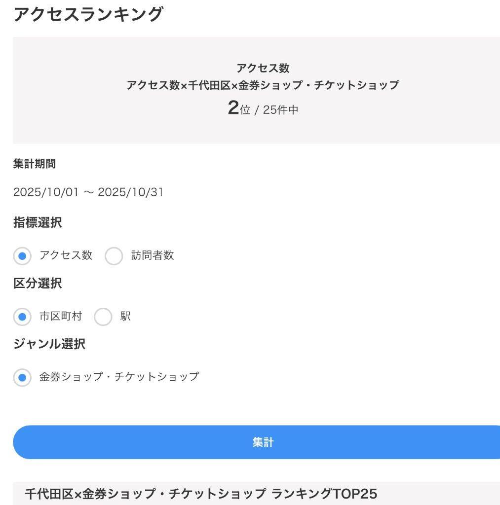 国内最大級のオンライン商店街・エキテンが管理する千代田区×金券ショップ・チケットショップ部門の2025年10月アクセス数ランキングで、チケット&トラベルT-1は2ヶ月連続の2位 ekiten.jp/shop_766123/ #金券ショップ #チケットショップ #エキテン #アクセスランキング #千代田区 #水道橋