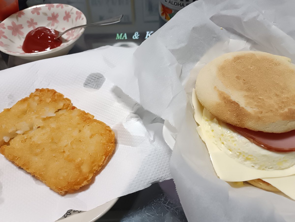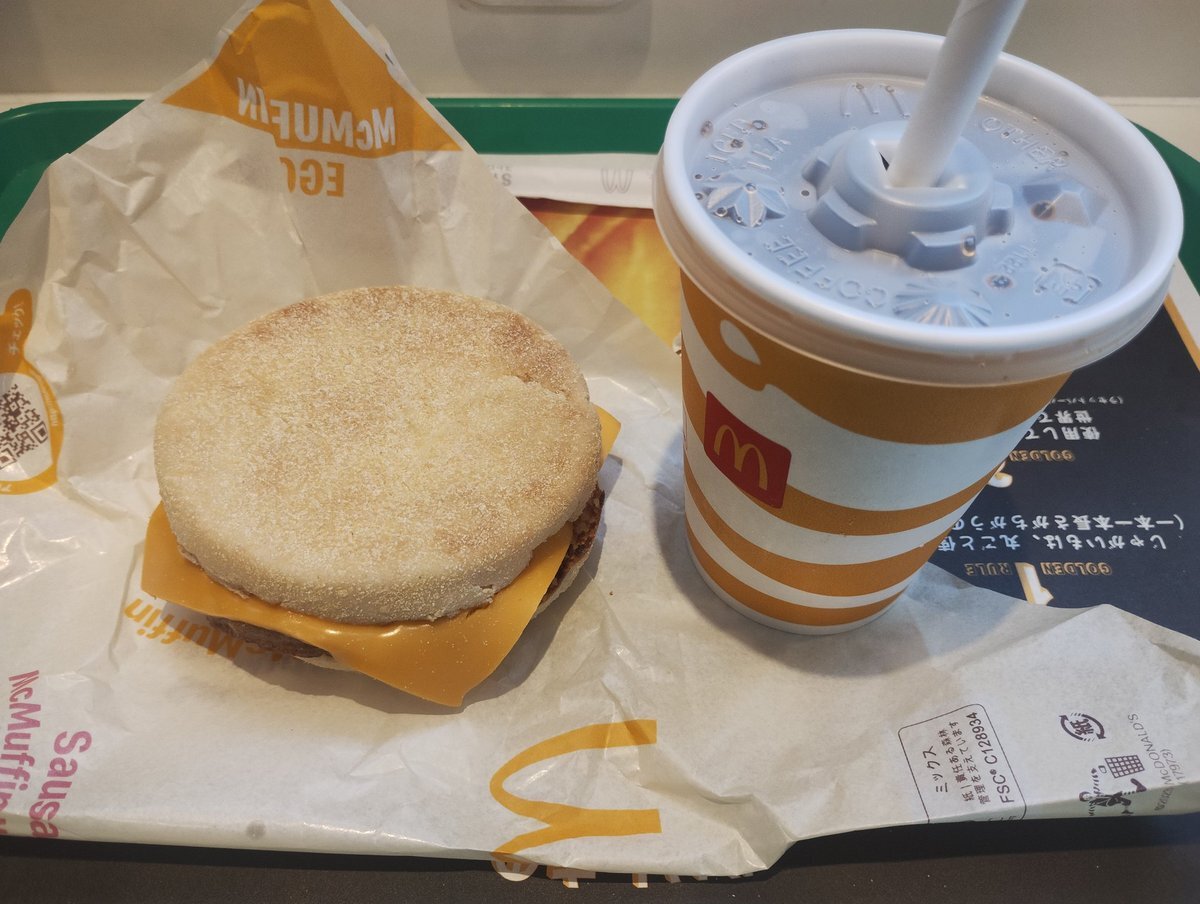朝飯は #マクドナルド で #朝マック (テイクアウト) #エッグマフィン #ソーセージマフィン #ソーセージエッグマフィン #タブチソーセージマフィン で👇 pic.x.com/FeOAXgYwoN