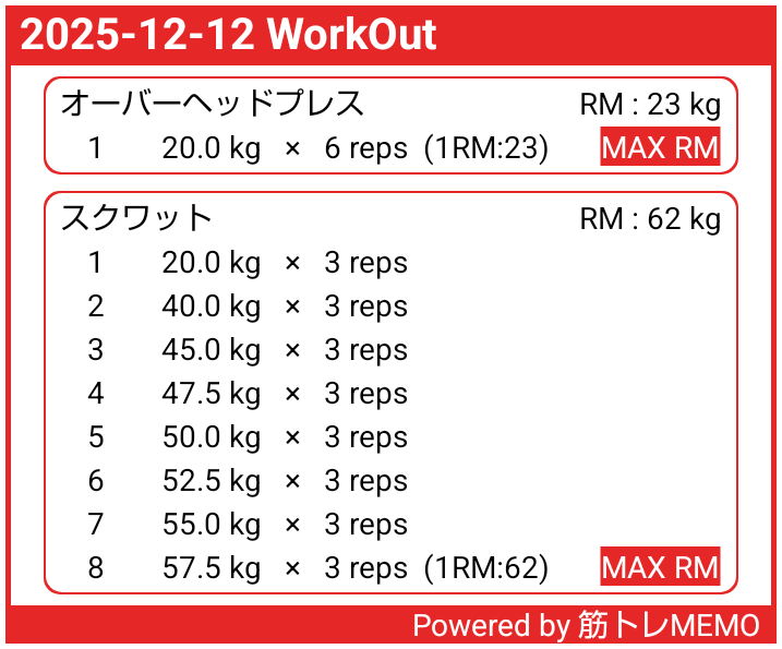 どうも僕です 今日の #スクワット フォームが悪い 若干腰に来た しかし最後の1発はとても良かった やはり俺はかかと重心気味の意識のほうが良いみたいだ #ジム #筋トレ #エニタイム #オーバーヘッドプレス #筋トレMEMO x.gd/Q7PW6 pic.x.com/0RNWpVXmBu