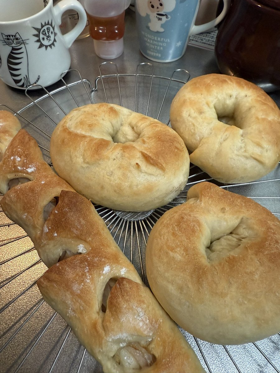 ベーグルぽい何かとベーコンエピ(ハム)っぽいのができた🥯 途中で失敗なのがわかったので、茹でるのと茹でないとどう違うか実験(`・ω・´)و✧ あと同じ生地でエピの成形したくて挑戦🌾 🍁🍂🐻🌳 ベーグルサンドとエピ エピ美味しすぎた❣️(完食) #パン作り #ベーグル #エピ #猫好きさんと繋がりたい pic.x.com/pAAImsMWBW