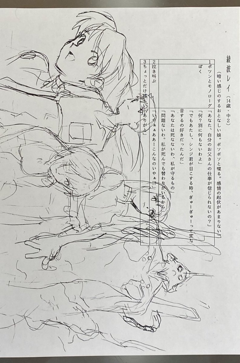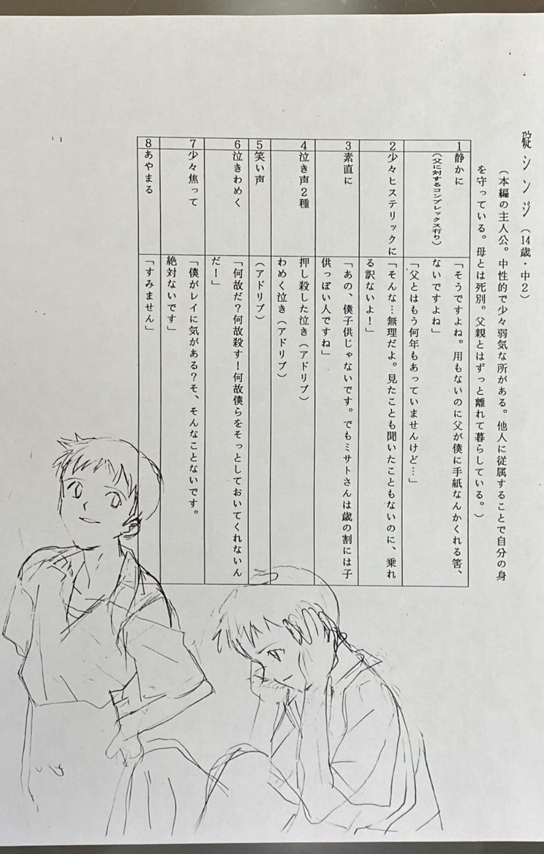#エヴァ25周年 『新世紀~』蔵出し 貞本氏のキャスティングオーディション用原稿用紙のコピー。オーディションの最中に参加者の声をスタジオで聞きながら貞本氏が原稿に描いていた落書きがある。諸般の都合でアスカ役のオーディションはなく、女性キャラ3人、特に綾波レイの参加者から選ぶ流れだった pic.x.com/0HIfCOeiFu