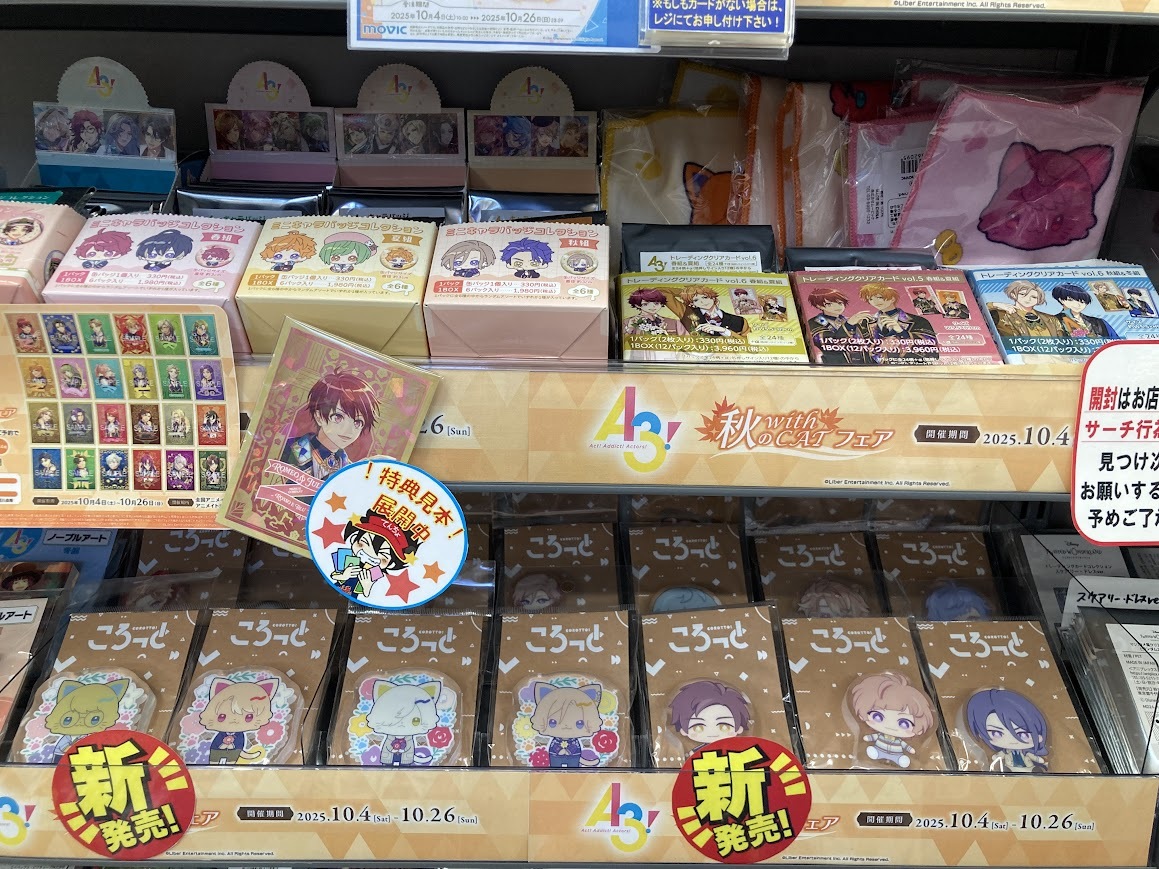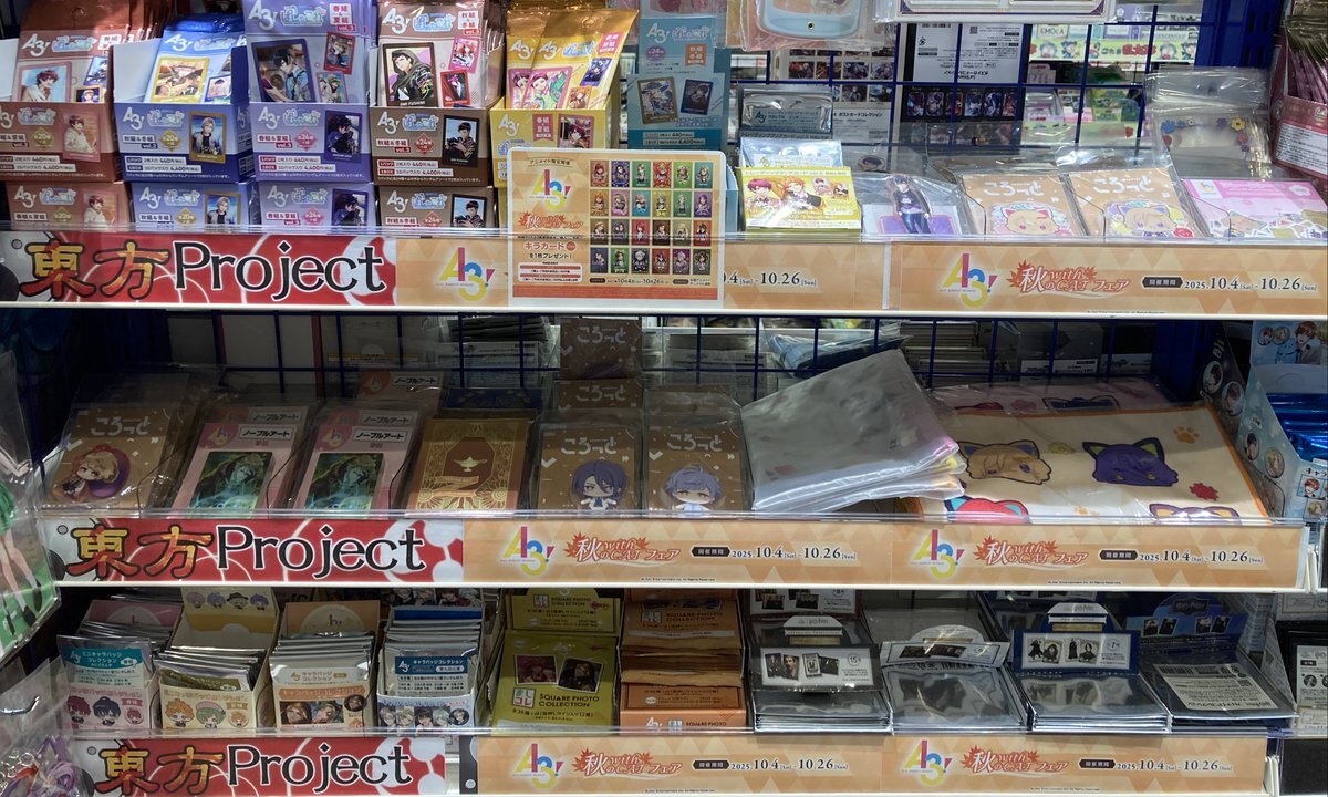 【フェア情報】 「『A3!』秋の with CAT フェア」は10/26(日)までの開催ぜよ! 期間中、関連商品をご購入・ご予約で【キラカード(全24種)】を1枚プレゼント! フェアの詳細はPOPをチェックぜよ! #エースリー pic.x.com/g0Eas6Z9g1