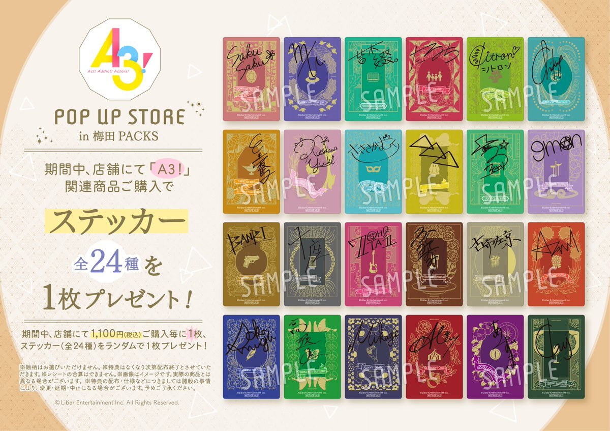 【梅田/特典情報】 『A3!』MANKAIカンパニー第二回特別公演記念SHOP お買い上げ1,100円(税込)毎に「ステッカー(全24種)」をランダムで1枚プレゼント! ※レシートの合算はできませんのでご了承ください。 ※特典はなくなり次第終了となります。 HP⇒ikebukuro-packs.com/shop/title_ite… #エースリー pic.x.com/3ml3aQsq0m