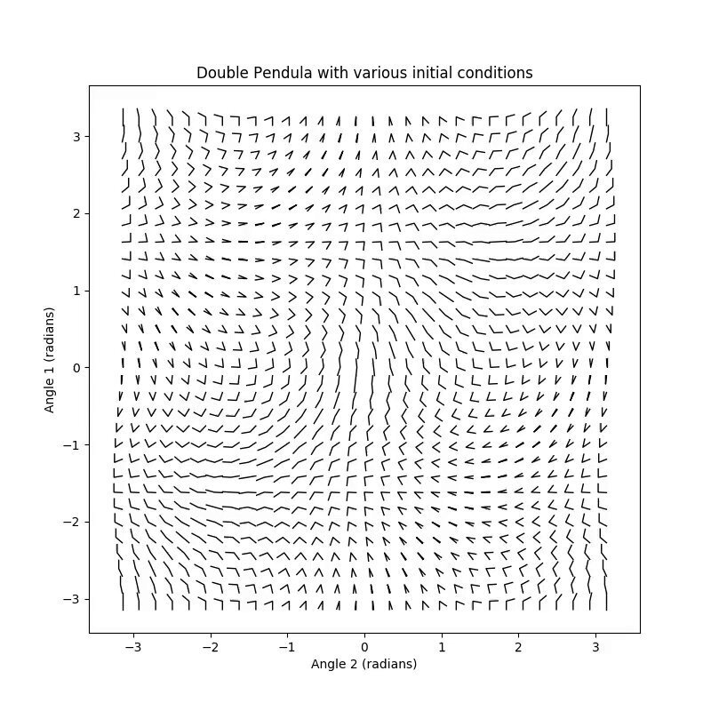The double pendulum is a good reminder of why robotics is hard. Tiny changes in motion can cause wildly different outcomes. Chaos hides in every joint. Visualization by Jonathan Nafziger jnafzig.github .io/2018/02/05/double-pendulum.html