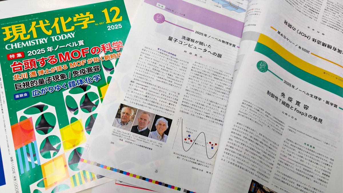 ノーベル賞特集号の『現代化学』12月号がまもなくできあがります🙌 発売日は11月19日(水)! 予約受付中です! amzn.asia/d/3tlXTmW 電子版は弊社HPより11月14日(金)からお買い求めいただけます👇️ tkd-pbl.com/book/b10152217…