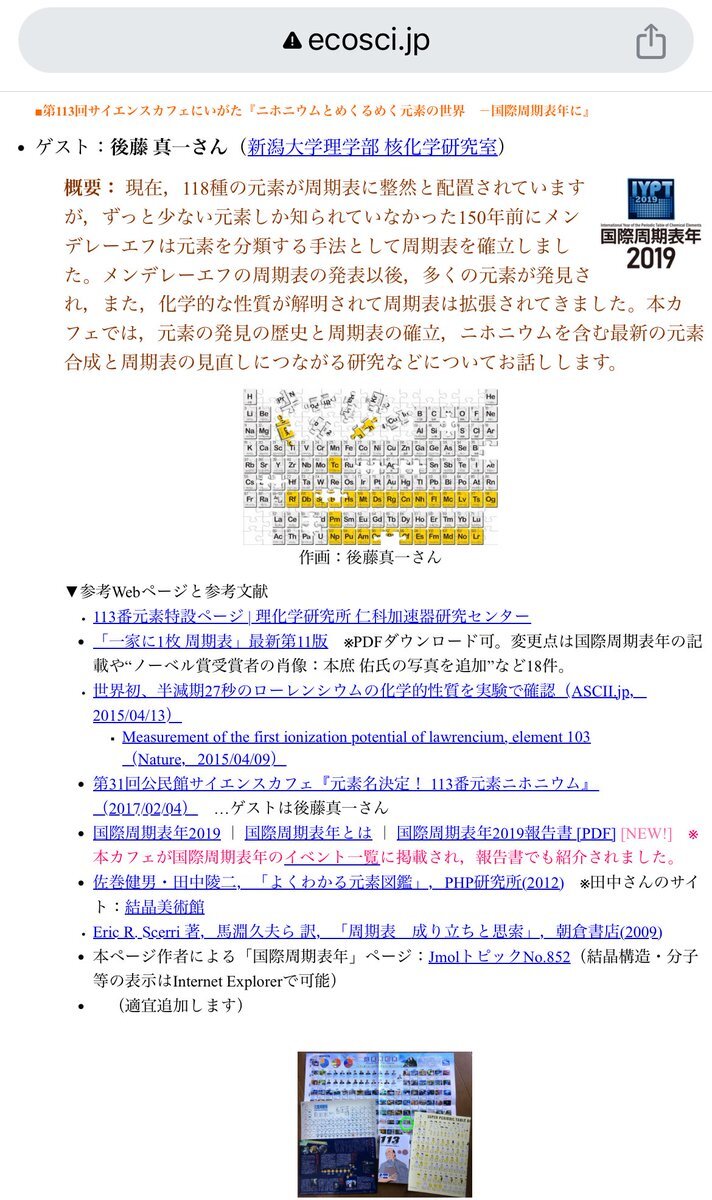 #カガク。今日は #物理の日。Nh もその理由に。2019年開催第113回サイエンスカフェにいがた『ニホニウムとめくるめく元素の世界 -国際周期表年に』 ecosci.jp/n-cafe/yokoku1… pic.x.com/OSX8Bxc369