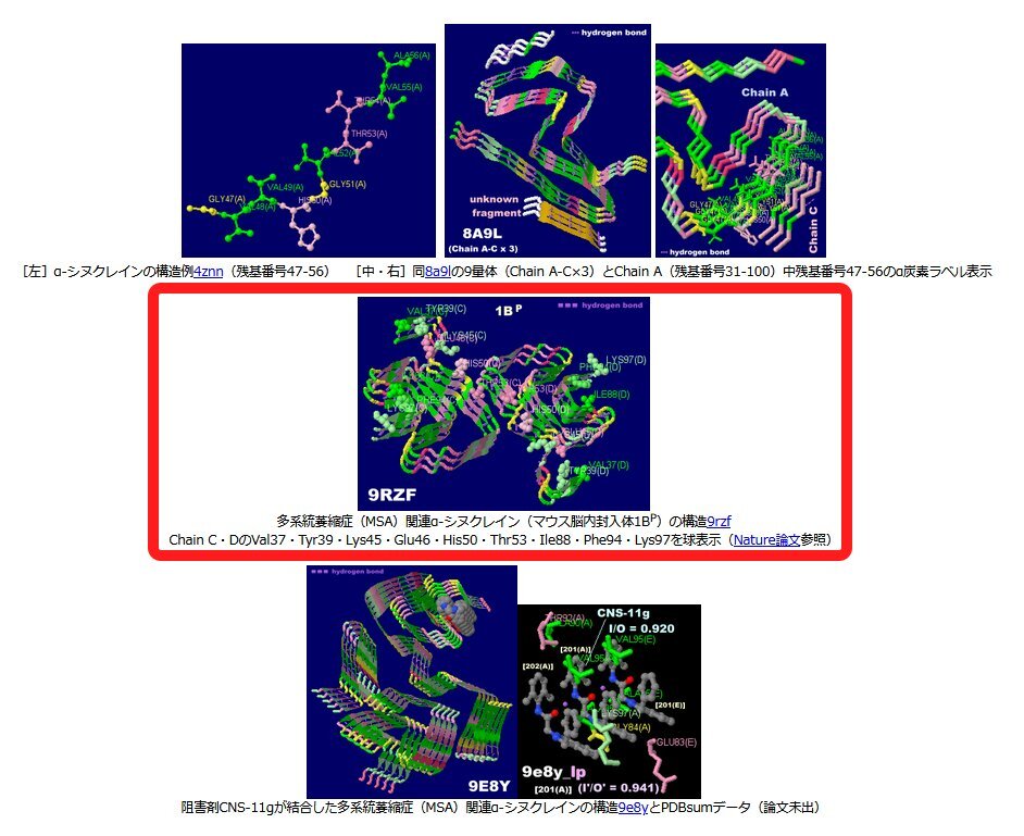 #カガク###生体分子#分子。多系統萎縮症(MSA)関連α-シヌクレイン構造研究が2件,赤枠はNature論文のPDB 9RZF(他に9EUUあり)でその下の9E8Y(他に9E8U・9E8V・9E8W・9E8Xあり)は論文未出。JmolトピックNo.622に追記。 ecosci.jp/chem13/topics1… pic.x.com/aB7bjnclBr